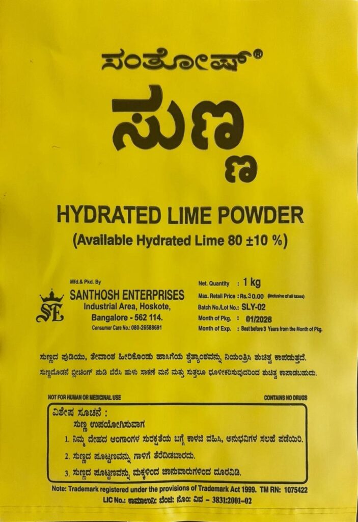 The Hydrated lime is sold in the markets under the brand name “Santhosh”, with available Hydrated lime of minimum 80% +/- 10%. Santhosh Hydrated lime is a very useful bed disinfectant in sericulture, especially against viruses. It absorbs moisture and can be used to regulate bed humidity and maintain hygiene. Application of lime dust in combination with bleaching powder in and around
